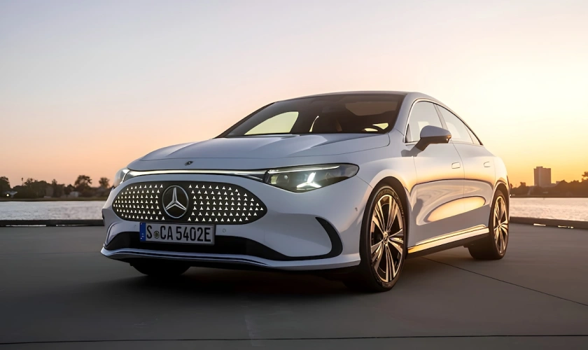 The upcoming Mercedes-Benz CLA EV adopts a striking coupe-inspired silhouette, with a strong emphasis on aerodynamic efficiency. At the front, the electric sedan features a gloss-black sealed grille embedded with illuminated three-pointed star elements, giving it a distinct visual identity. This is complemented by sleek twin-pod LED headlamps connected by a signature thin light strip.